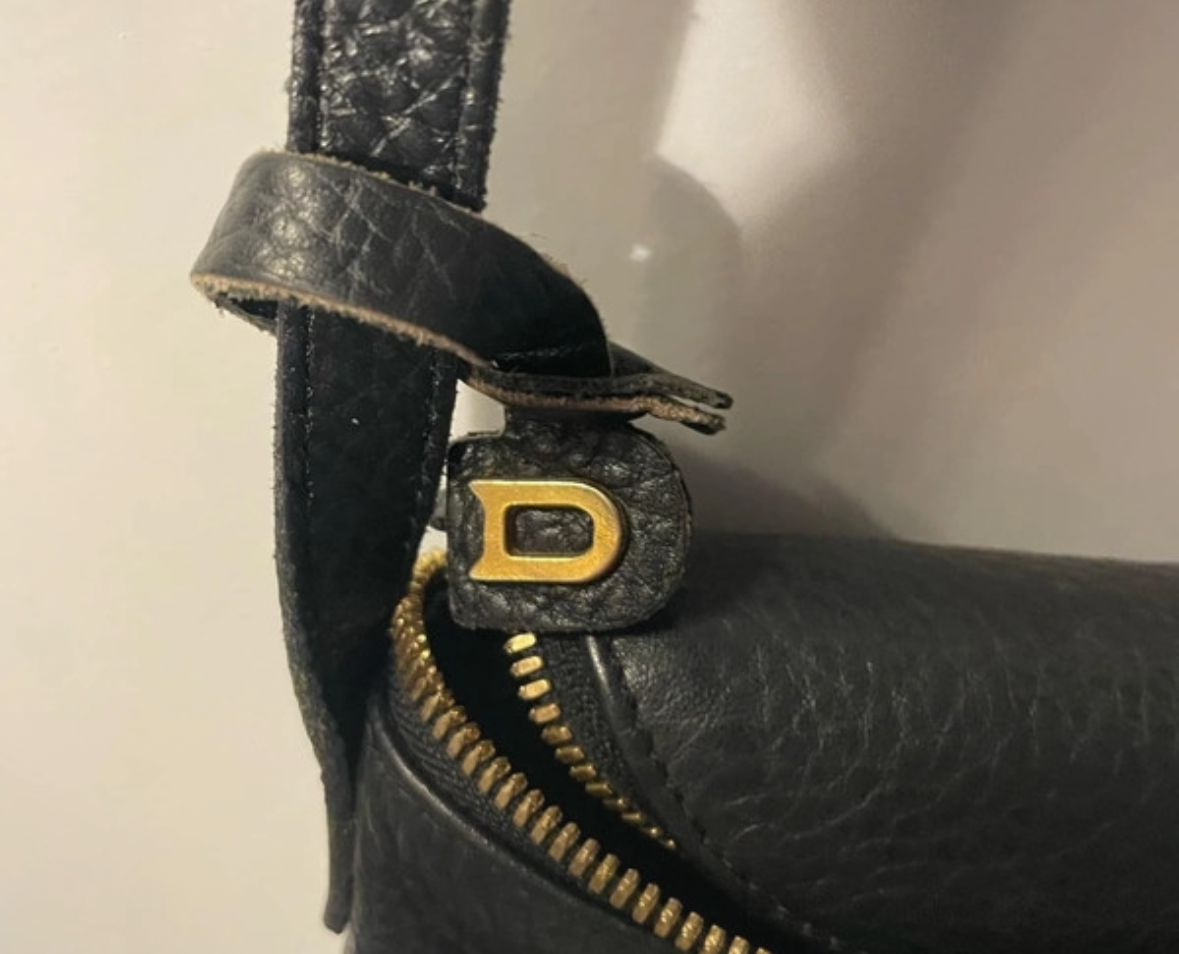 Bij een authentieke Delvaux is de ‘D’-hanger slank en perfect afgewerkt. Let vooral op de rand rond de metalen ‘D’: deze moet dun en overal gelijkmatig zijn.