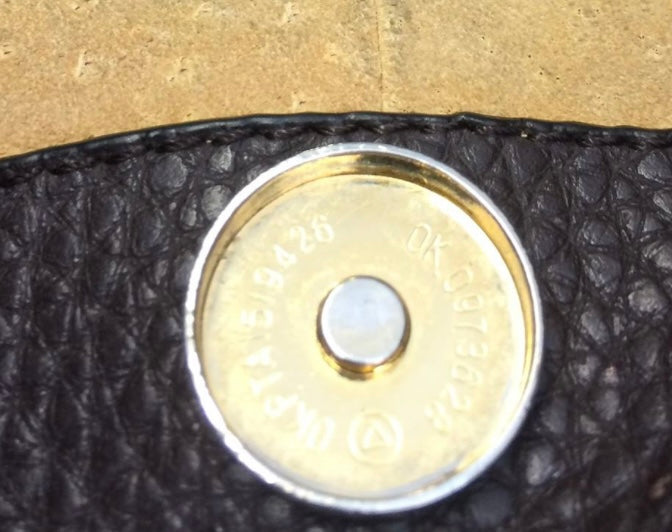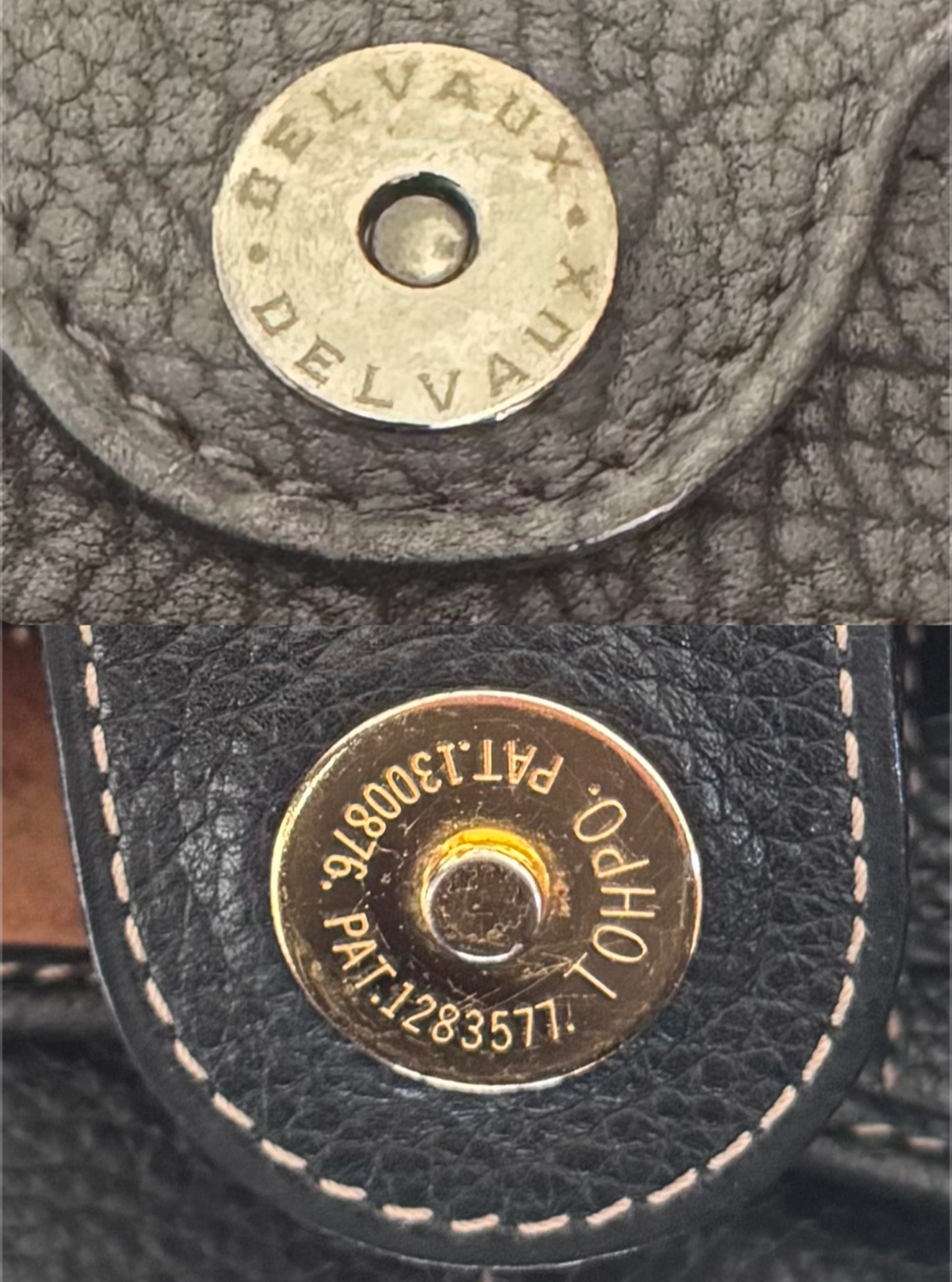 De magneetsluiting van een authentieke Delvaux heeft nooit een inkeping aan één kant (rechter foto). Bij de nieuwere sluitingen staat ‘DELVAUX’ er vaak ingedrukt, zoals je ziet op de foto linksboven. Terwijl bij oudere modellen de authentieke sluiting vaak het woord ‘TOHPO’ draagt gevolgd door een nummer.